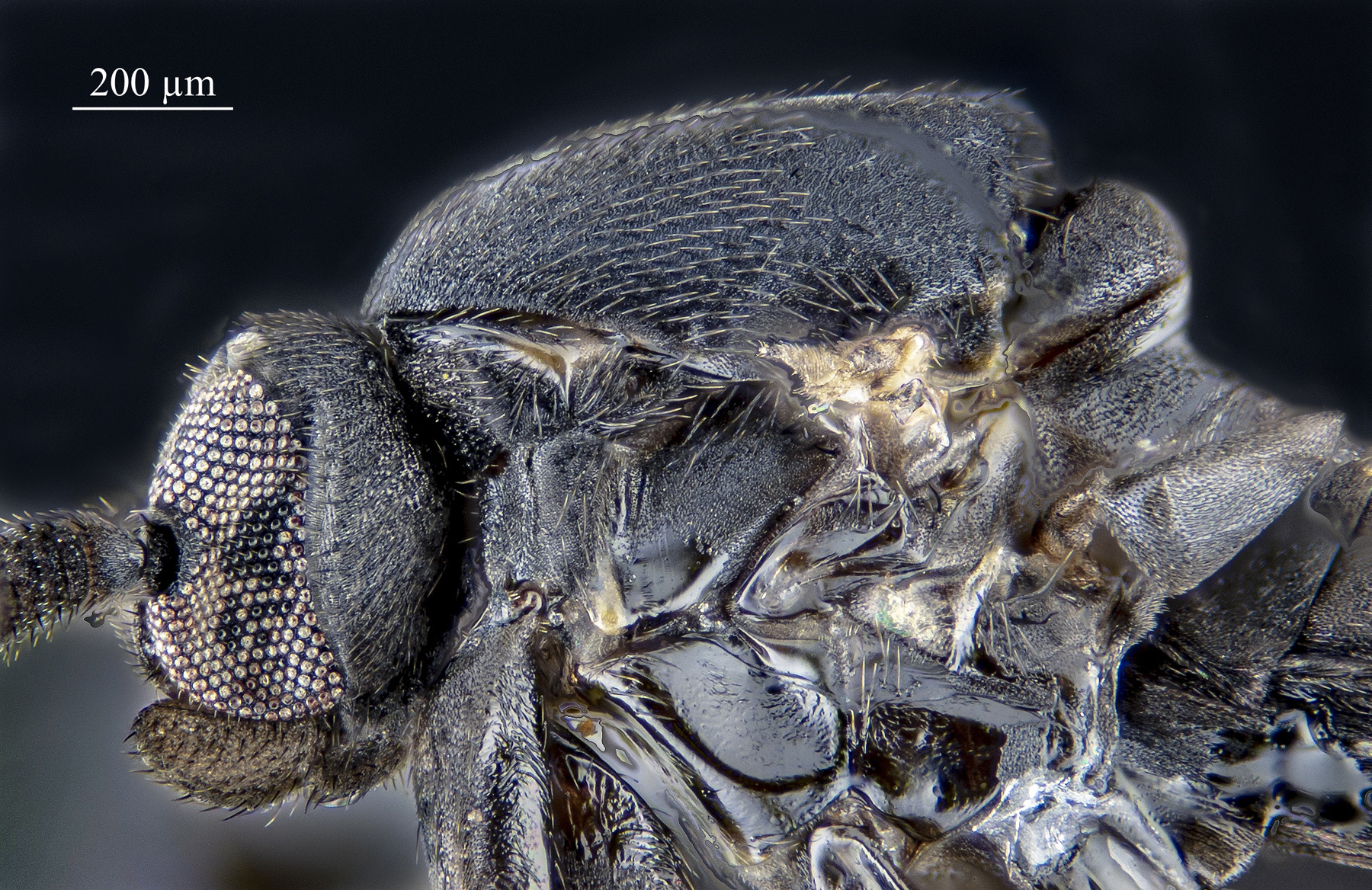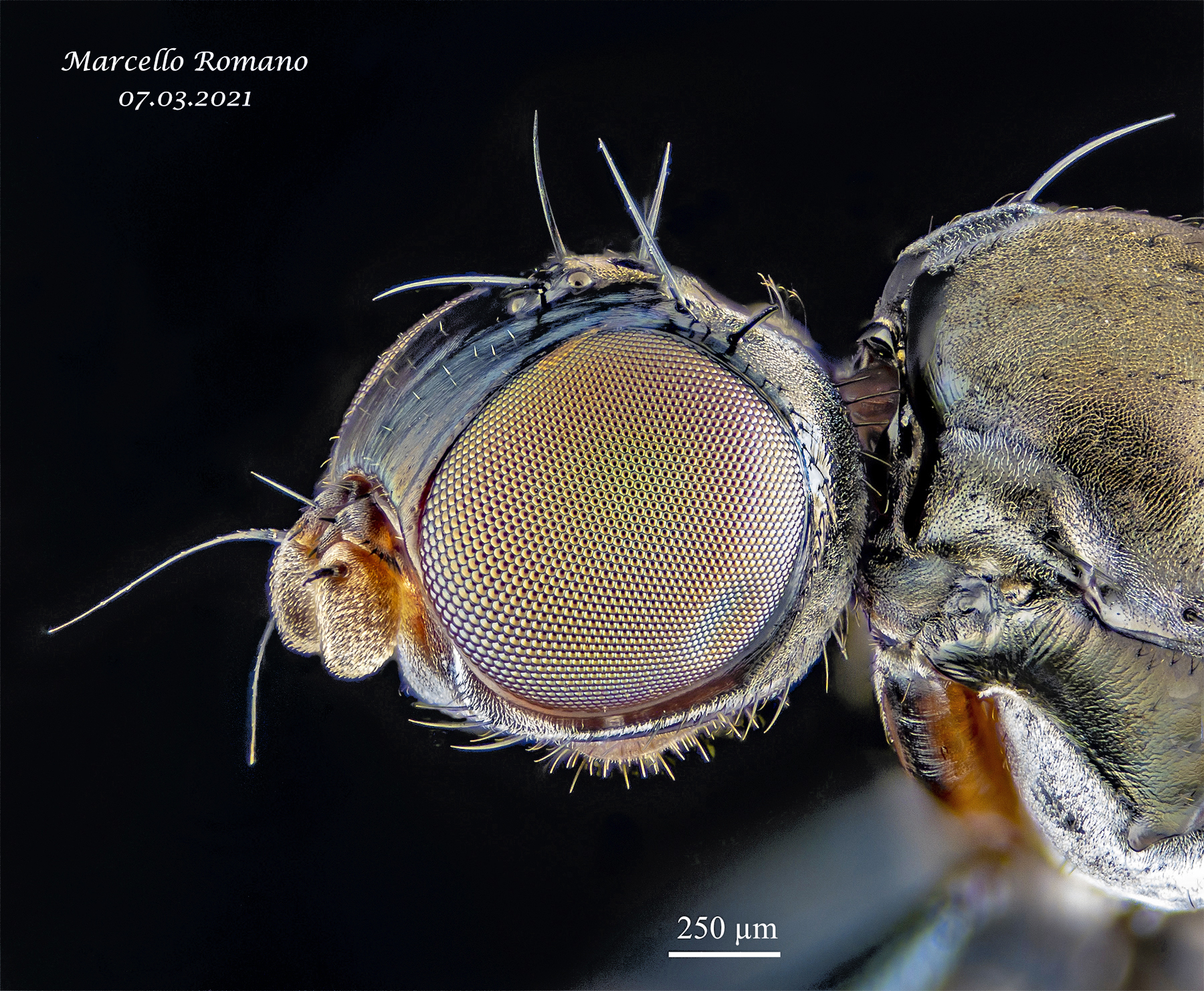 Quello che più mi ha colpito è la disposizione degli ommatidi, che non sono incastrati a mosaico, come avviene più spesso (vedi gli occhi del Sepsidae), ma relativamente distanziati l'uno dall'altro.