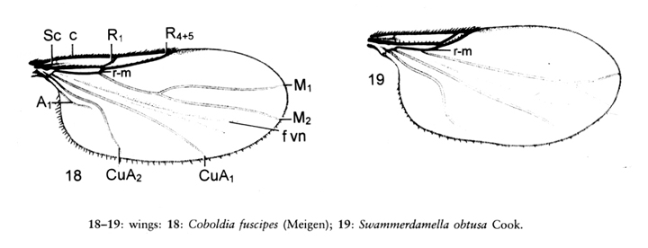 Un altro dettaglio che ho notato, e che secondo Haenni possiede un valore diagnostico, è la nervatura trasversale r-m, che risulta maggiormente "distinguibile" nella tribù Swammerdamellini sensu Haenni (cfr. ad es. Coboldia fuscipes con Colobostema):