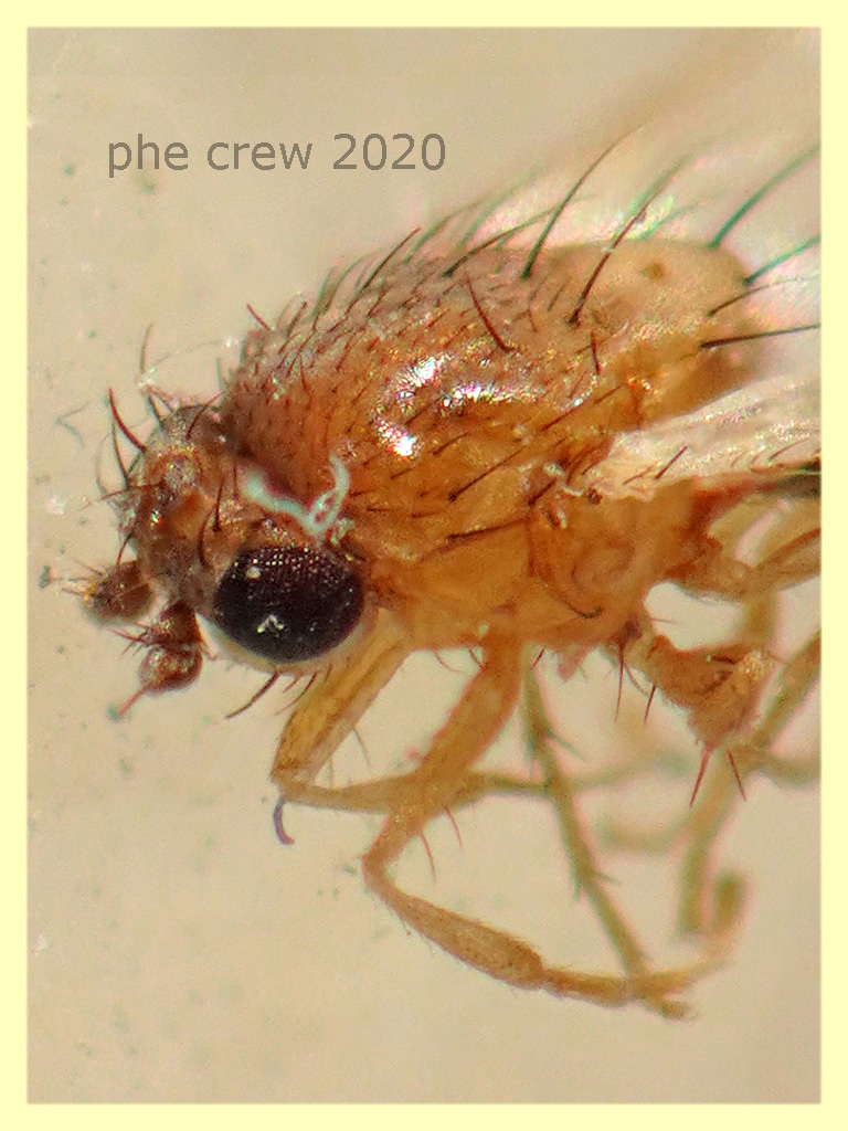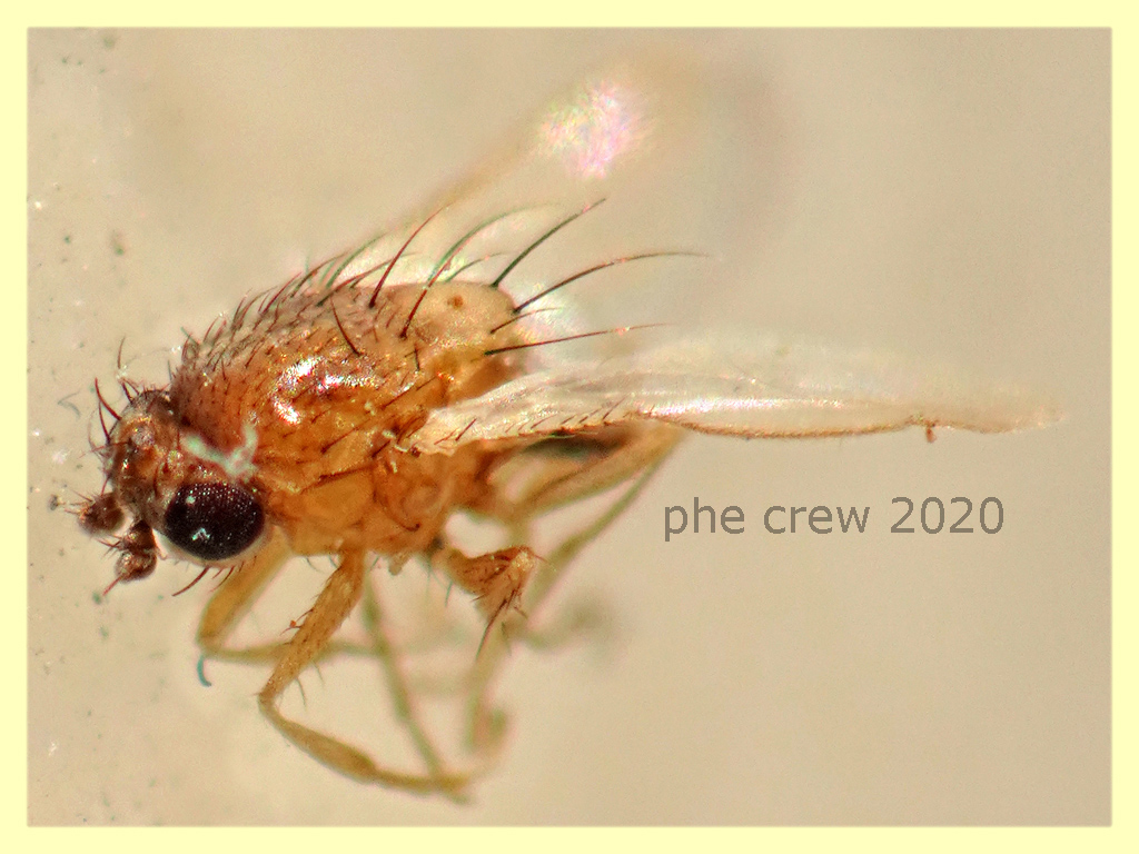 ...micro Dittero di 1,2 mm. morto in una plafoniera a led. Da DrawWing sembrerebbe appartenere alla famiglia Chloropidae si avvicina molto come misura e colore ad un Hippelates o qualche Tricimba..ma sembra essere troppo irta e nella venulazione alare c'è qualcosa che non va...Secondo voi è un Chloropidae ? |