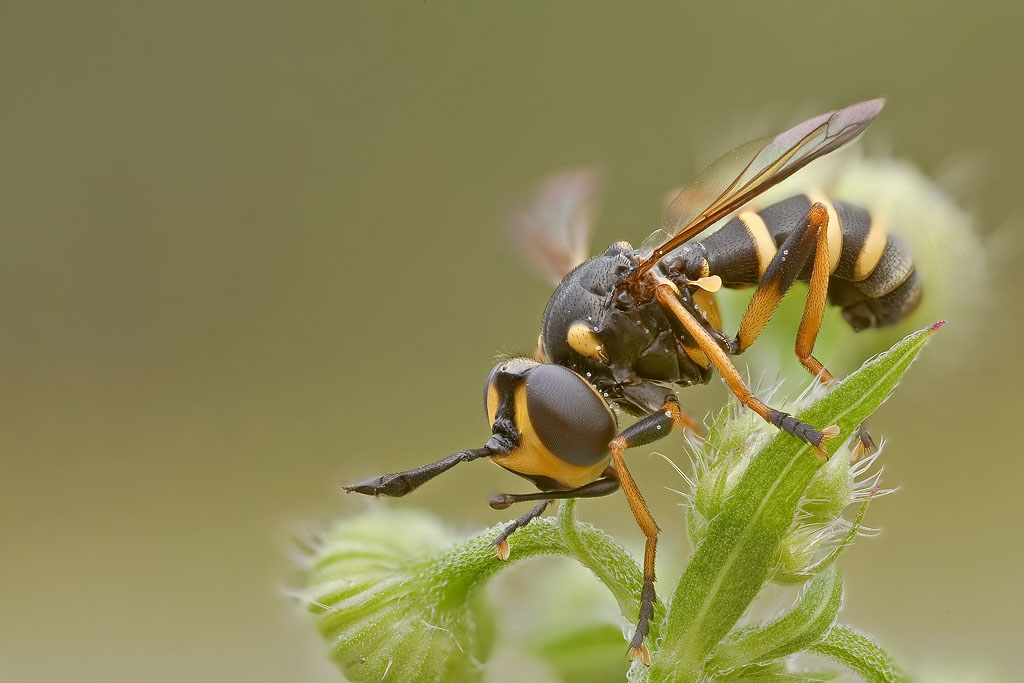 Confermo C. flavipes, questo è ovviamente un maschio... le femmine della maggior parte dei conopidi hanno i segmenti terminali dell'addome più o meno modificati in relazione all'ovideposizione... in particolare il il 5° sternite si prolunga spesso in basso in un'appendice variamente sviluppata, chiamata impropriamente "theca", che è utilizzata per aderire all'ospite durante la (solitamente traumatica) deposizione dell'uovo... nella femmina di C. flavipes la "theca" è nera, appuntita ed molto sviluppata... guarda se ne trovi una da fotografare (è una specie comune anche qui al Centro, in collina e montagna)!
