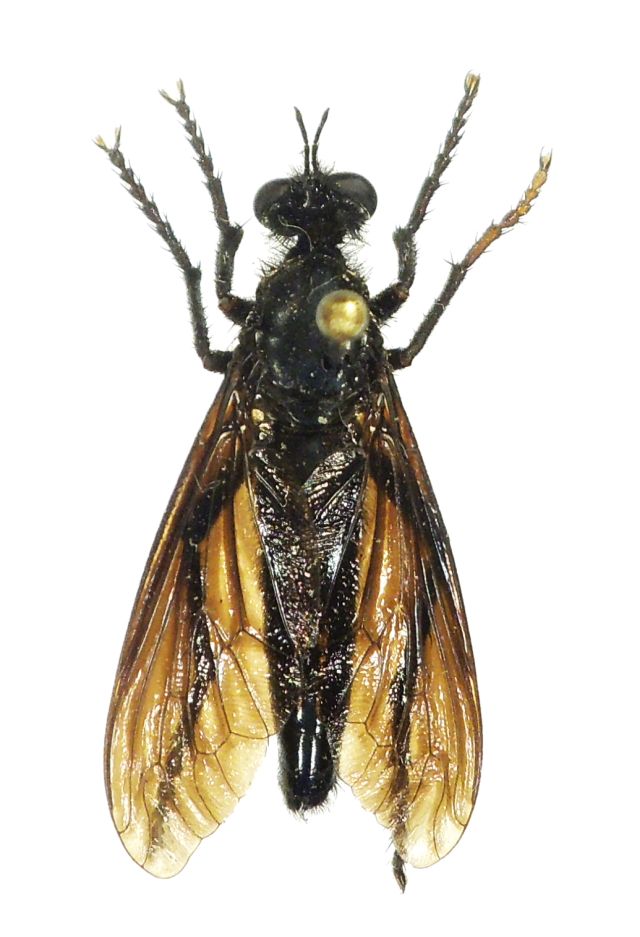 Si riesce a riconoscere? mm 19. Clipeo con lunghe setole nere multidirezionate, fronte con corta pubescenza argenteo-dorata. Antenne con articolo 1 due volte lungo che largo, 2° appena appena più lungo con setole da metà all'apice, 3° più lungo dei due precedenti uniti, 4° stretto, poco più lungo che largo e sembra inglobare gli altri con l'ultimo piccolissimo che spunta appena, sì che l'antenna sembra troncata. Grazie.