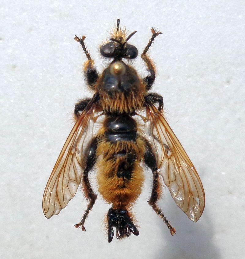 In quest'ultima foto l'insetto a destra è un Pogonosoma maroccanum (Fabricius, 1794). Dalle chiavi del Seguy direi che il primo soggetto è Laphria flava (Linnaeus, 1761); dammi però ancora un po' di tempo per altri controlli.