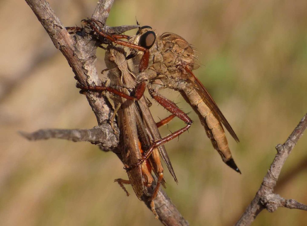 L'asilidae è diverso, un po' più piccolo, e la cavalletta è simile (è una specie con tegumento abbastanza leggero), però il rostro è piantato nel collo.