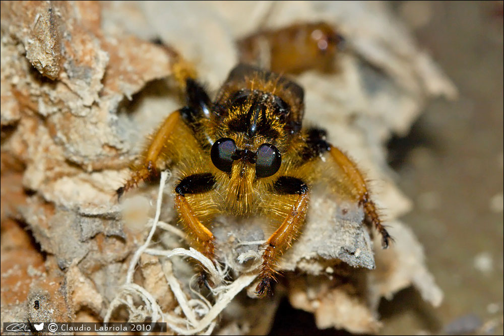 erano le 21:00 circa di martedì 25 maggio 2010, stavo mettendo un po' di ordine nel mio piccolo studiolo, se così si può dire, perchè di ordine in quella stanzetta ancora non ne ho mai visto :( Stavo spostando un terrario dove avevo momentaneamente appoggiato alcuni pezzi di legno di fico da dove due settimane prima circa erano sfarfallati una decina di Xylotrechus stebbingi, cingo le braccia intorno al vetro per sollevare il terrario e in automatico abbasso la testa che porta il mio sguardo ad osservare dall'alto l'interno. I miei occhi vengono immediatamente attratti da alcune spoglie che fuoriescono da uno dei pezzi di legno, una specie di crisalide ... mi blocco immediatamente ed incomincio a scrutare l'interno del terrario, mi è subito venuto in mente che si poteva trattare di qualche lepidottero, ed infatti era quello cercavo, quello che si era figurato nella mia mente. Quando i miei occhi ad un tratto si soffermano su un "essere" che non avevo mai visto, :shock: meraviglia e stupore... Sono stato un po' ad osservarlo. Non l'ho inquadrato immediatamente, ho pensato prima ad un qualche Imenottero ma poi osservando meglio la sua posture e sopratutto la sua "faccia" la mia attenzione si è spostata su Dittero predatore, decisamente e senza alcun dubbio, aveva proprio la faccia di un Asilidae.