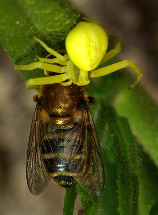 Il ragno dovrebbe essere Misumena vatia Thomisidae, ma la preda cos'è? mi sembra un Syrphidae, ma credo di non averlo mai incontrato prima.