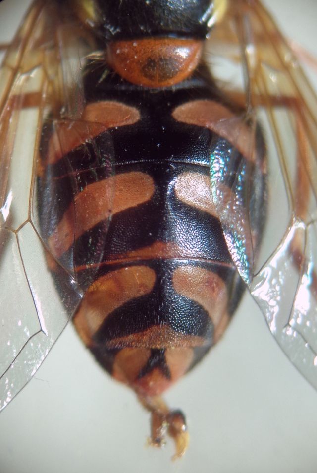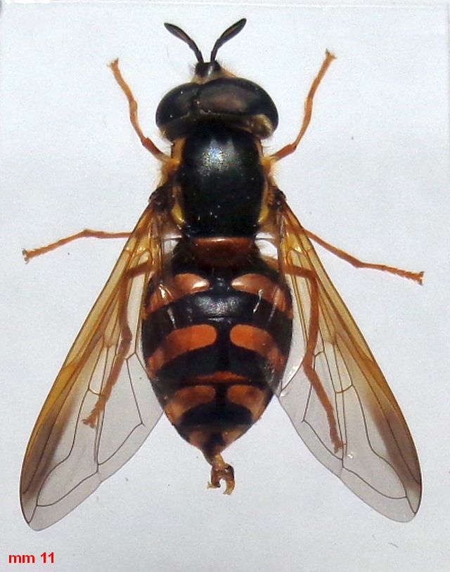 Ciao Carlo, grazie ma avendo trovato le chiavi che citi (credo) ho provato a percorrerle e arriverei a Chrysotoxum intermedium del punto 34; dal punto 1 arriverei al 29 considerando il 3° art. antennale + lungo di 1°+2° e da lì, attraverso i lunghi peli dello scutello, tergiti non dentati, colore sterniti e aspetto di mesoscuto e 2a cell. discale (con striscia priva di microtrichi). Posto due foto in cui meglio si evidenziano le antenne e lo scutello; dimmi se concordi. Le prime foto mal si prestano a valutare le lunghezze relative degli antennomeri. :hi: