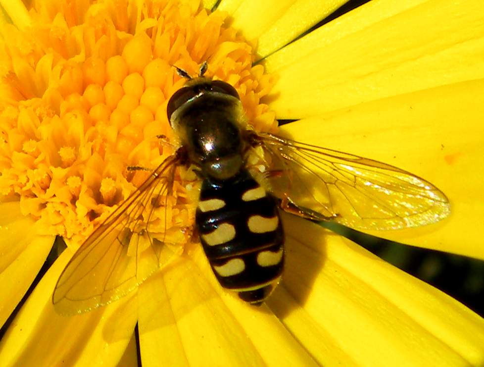 Manterrei femmina di Eupeodes sp. ma sarei più propenso pe Eupeodes luniger. Difficile avere certezze: - le macchie della seconda e della terza serie (tergiti 3 e 4) non raggiungono il margine laterale (la macchia gialla è completamente circondata di nero - il margine laterale del 5° tergite è giallo Per contro la macchia frontale non sembra avere la caratteristica forma ad Y. |