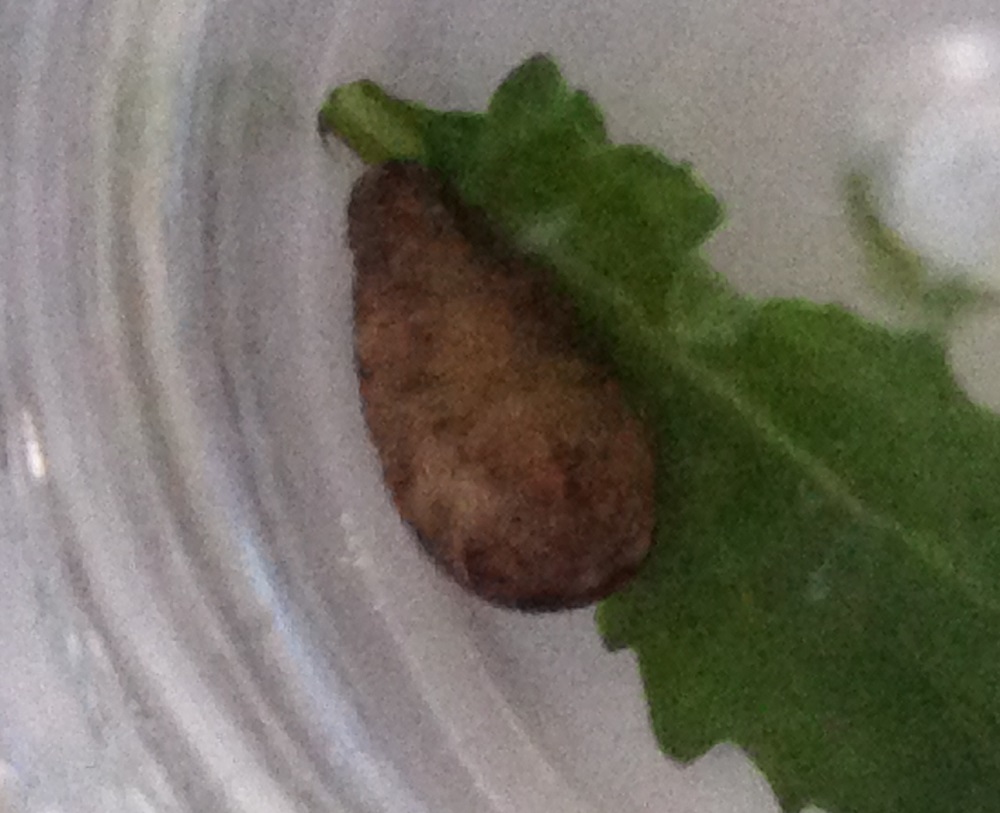 l'ho trovata attaccata sotto ad una foglia. E' inerme e rigida, credo sia una pupa di qualche insetto ma non riesco ad identificare quale, grazie.
