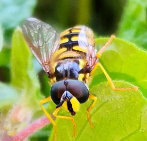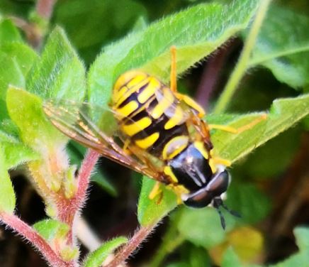 Ciao, ho trovato questa strana 'vespa' comodamente appollaiata su di una foglia di ... (non ho idea di cosa sia, vedi foto n° 5), contornata da piantine di menta (foto n° 4). E' stana perché è un po' tozza ed ha un paio di occhioni che a me ricordano molto quelli delle libellule. Mi sapete dire cos'è? E' aggressiva? (ho sempre un po' timore degli imenotteri :twisted: )