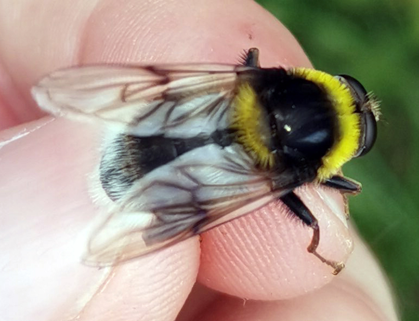 Questo è uno dei casi migliori di mimetismo batesiano che abbia mai visto, imitando alla perfezione la colorazione e il volo dei bombi, rendendosi indistinguibile da diverse delle specie che volavano nella stessa zona. Mi sono accorto che fosse un Syrphidae solo dopo averlo catturato nel retino.