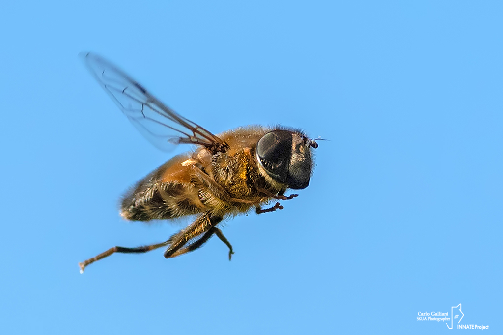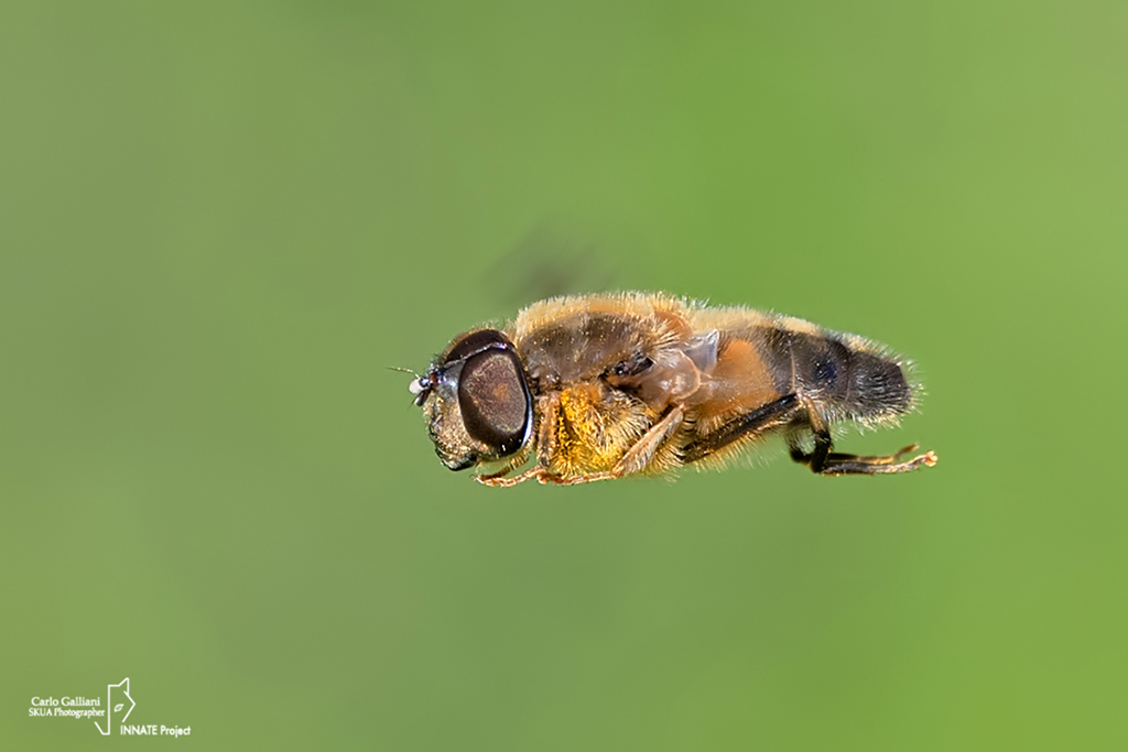 I tarsomeri delle zampe anteriori e medie sembrano gialli, quindi Eristalis pertinax (Scopoli, 1763).