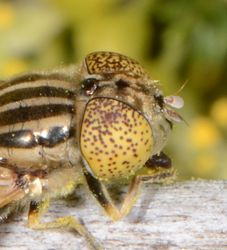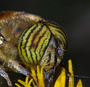 A me non sembrano occhi da Eristalinus, che, oltre che "puntinati" o "striati", sono chiari. Gli occhi sono la cosa che attira subito l'attenzione quando si vede un Eristalinus, anche non da vicinissimo. Se si trattava di un Eristalinus Marco, a prescindere da come poi è riuscito a fotografare il soggetto, li avrà certo notati. Lasciamo giudicare a lui: