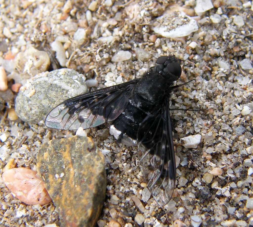Questo bombylide di circa 10 mm (vado a memoria perché non l'ho preso) mi ha incuriosito per il colore nero del corpo escluso l'apice dell'addome che era di colore bianco argentato che purtroppo in foto non si vede bene. Potrebbe trattarsi di un Anthrax sp.? Grazie a tutti.