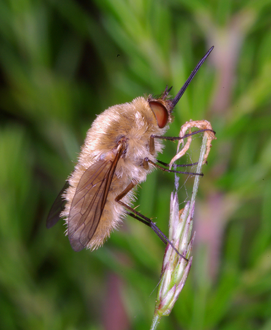 Grazie Gian, aggiungo una visione più dorsale, che mostra l'ala meno inclinata.... anch'io pensavo a Bombylius, ma di molte delle specie del genere non ho mai visto immagini ne letto descrizioni.