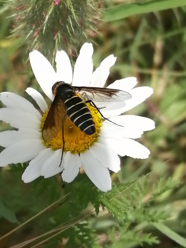 Un altro dittero, credo, amante dei fiori e imitatore di imenotteri. Non ho idea di chi sia... qualcuno mi aiuta? Aveva un modo tutto suo di tenere l'apice dell'addome all'insù