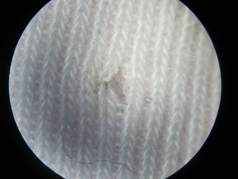 Pure questa storia del filo delle cucitore che sparisce è veramente curiosa. Probabilmente è fatto di un materiale diverso dal resto del tessuto. Che sia qualcosa di molto piccolo, anche rispetto all'ordine di grandezza degli insetti che normalmente danneggiano il vestiario?