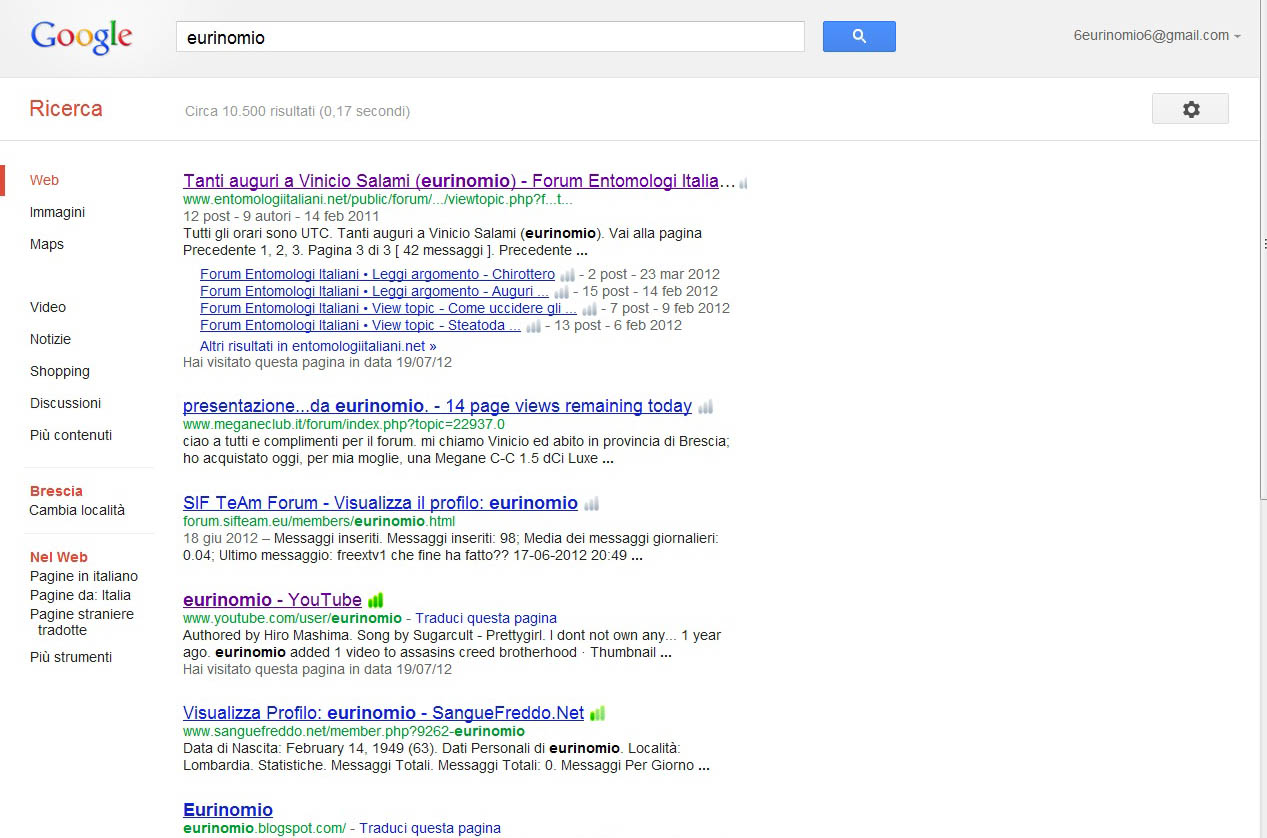 è anche una questione di privacy...se digitavi "eurinomio" su google, prima che iniziasse questa avventura, venivano fuori alcune discussioni alle quali avevo partecipato sulle board satellitari che frequentavo, riferite esclusivamente al mio nickname...adesso, facendo la stessa cosa si ottiene questo risultato (soprattutto perchè ieri, dopo avere letto il post di 00xyz00, mi sono ricordato di una vecchia discussione ed ho modificato il titolo in tutti gli interventi, nella speranza che non apparisse più quello che invece si vede ancora...così facendo ho fatto schizzare il tutto al primo posto).