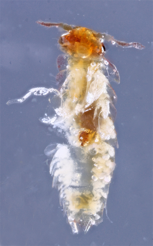 noto che si riconoscono un capo ben formato (vagamente "catopoide") con occhi e antenne risolti, un pronoto apparentemente sclerificato sebbene in foto appaia diafano, segmenti addominali (? scoperti ?), gonostili (?).