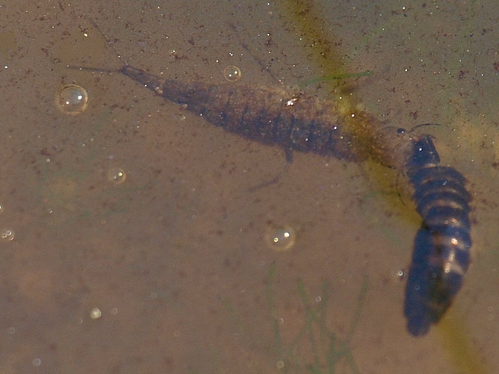 Non ho mai visto prima questa specie, che però era comune in quella pozza d'acqua, in cui la maggior parte si muoveva lentamente a pelo d'acqua. Questa larva ha due lunghe antenne filiformi, appena più corte del corpo.