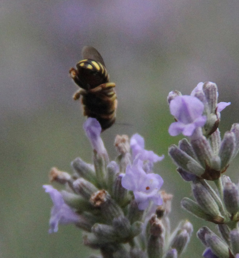 Non capisco cosa siano, se siano vespidi o no. hanno un modo di volare diverso dalla vespa comune ma anche dalle api, stanno sospese in volo e si muovono a scatti,. sono molto aggressive sia con altri commensali che usano la lavanda come fonte di cibo ( ho qualche bombo e ape, anche se questi due preferiscono la malva e i fiori di zucca ) sia con me, che purtroppo avendo una maxi pianta di lavanda su un passaggio per arrivare nell'orto ci devo passare spesso . Ho notato che sono presenti solo sulla lavanda . le prime due foto sono di un altro insetto che frequenta la lavanda... e che viene scacciato dal secondo.