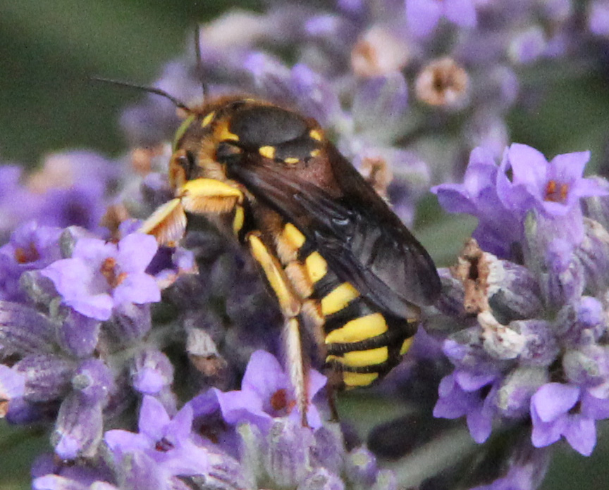 Non capisco cosa siano, se siano vespidi o no. hanno un modo di volare diverso dalla vespa comune ma anche dalle api, stanno sospese in volo e si muovono a scatti,. sono molto aggressive sia con altri commensali che usano la lavanda come fonte di cibo ( ho qualche bombo e ape, anche se questi due preferiscono la malva e i fiori di zucca ) sia con me, che purtroppo avendo una maxi pianta di lavanda su un passaggio per arrivare nell'orto ci devo passare spesso . Ho notato che sono presenti solo sulla lavanda . le prime due foto sono di un altro insetto che frequenta la lavanda... e che viene scacciato dal secondo.