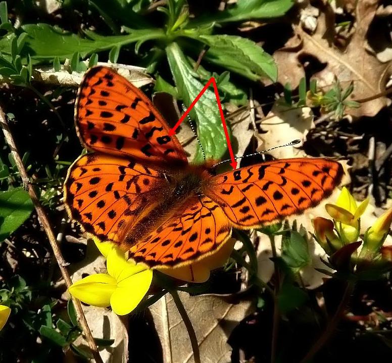 In tutte le foto che ho visto di B.euphrosyne la macchia scura evidenziata con le frecce non è mai completamente nera, ma è più o meno aperta al centro. tra l'altro le lunule del bordo sono in genere staccate fra loro anche se non sempre: in ogni caso uno dei due caratteri è sempre presente, e mi sembra che nell'immagine di Ambro non ce ne sia nemmeno uno: Sicuramente quella che ha ripreso è una Boloria, non so se una selene, ma per me non è una B. euphrosyne