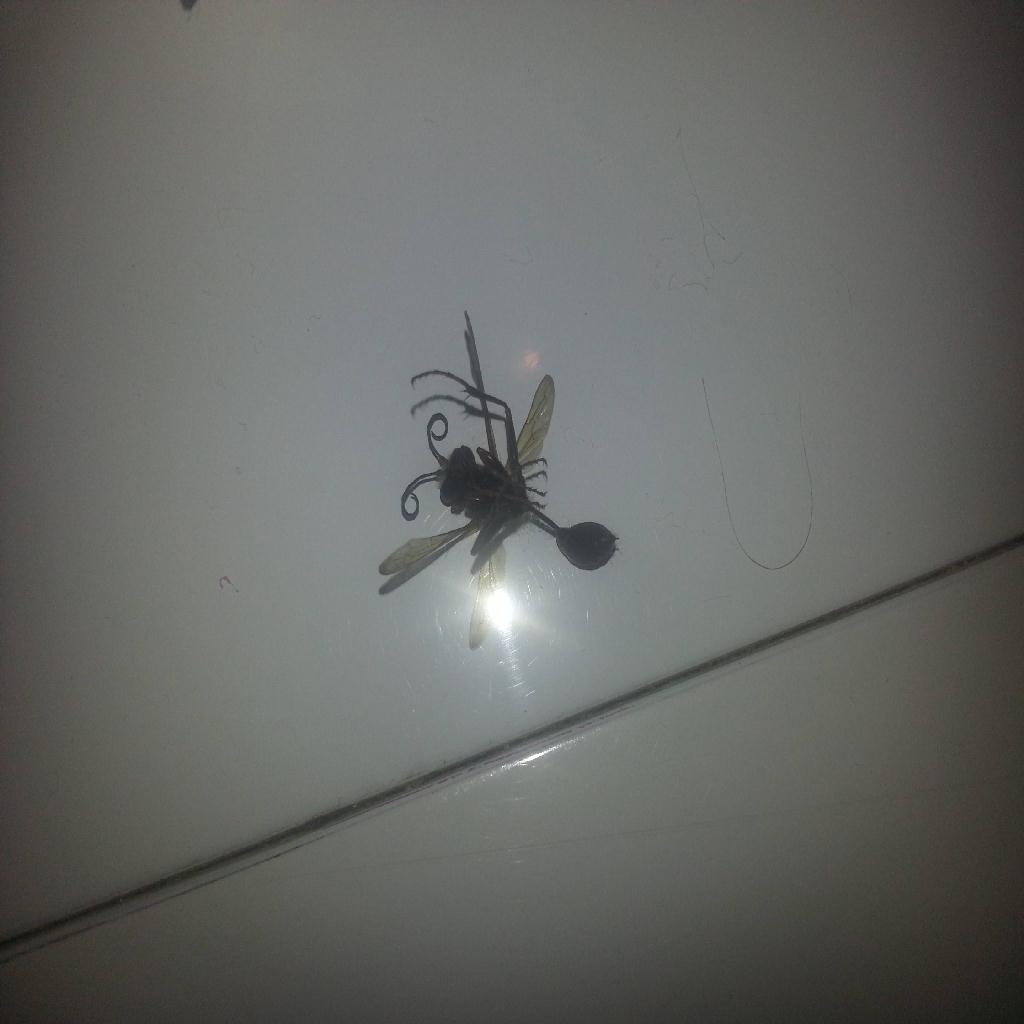 Nella foto è ritratto, con molta probabilità, un esemplare di Sceliphron sp. un Imenottero Apoideo appartenente alla famiglia Sphecidae. Si tratta di vespe solitarie che non di rado è possibile osservare anche nelle nostre abitazioni soprattutto nei periodi estivi. Vi entrano per cercare un posto per costruire i loro nidi costituiti di cellette di fango all'interno delle quali inseriscono le prede e le proprie uova.