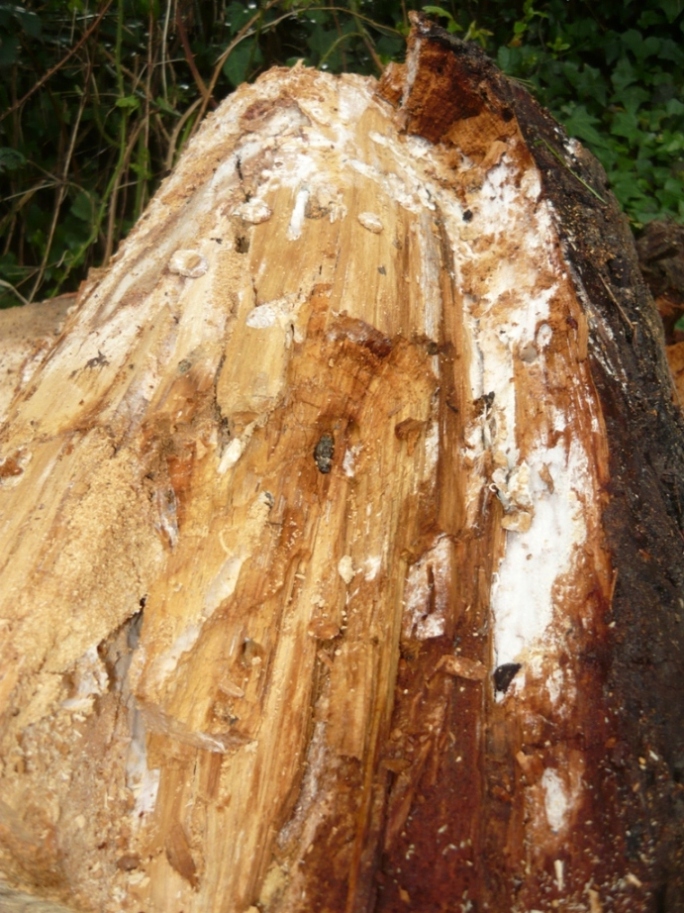 Qualcuno è scampato ai mosconi e, oggi, spaccando i ciocchi della stessa pianta ( Pinus halepensis), ma più in alto (il marciume era solo a livello radicale, son cascate delle larve...saranno i soliti Arhopalus