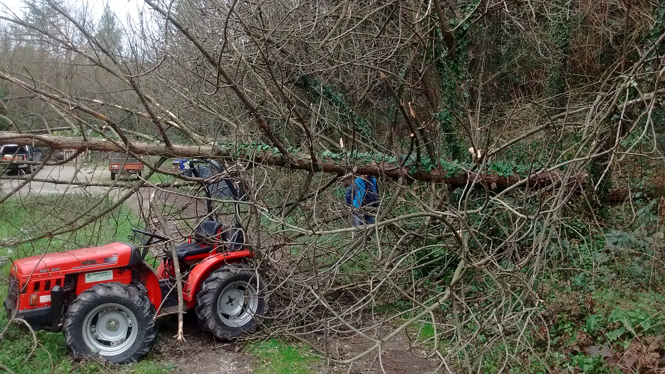 Beh, l'avevamo già tagliato, ma il maledetto si è appoggiato sul fico sottostante, che, essendo riconosciutamente un albero "traditore" (come diceva mio nonno) al quale non si può dar fiducia sulla tenuta dei suoi rami nell'arrampicarsi, non ci ha dato tempo e appena ho messo in trazione il Carraro ho sentito degli scricchiolii sospetti. In realtà io volevo stare più lontano, non è stata una mia idea :devil: :devil: :devil: . Quando sono andato per allentarlo in retromarcia, in un secondo è venuto giù, preciso preciso sul fedele roll-bar :ok: