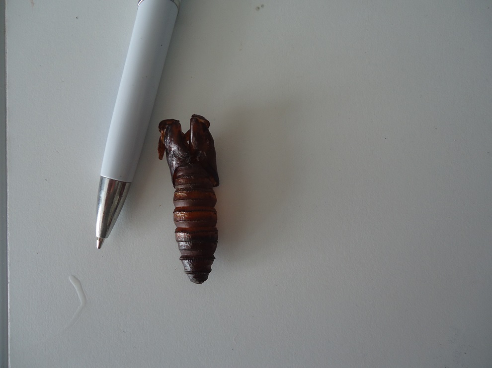 E' un'esuvia pupale di Lepidottero. Ricorda quella di un Cosside, ad esempio Cossus cossus. E' stata estratta da una galleria nel tronco di un albero, dalla quale sporgeva?
