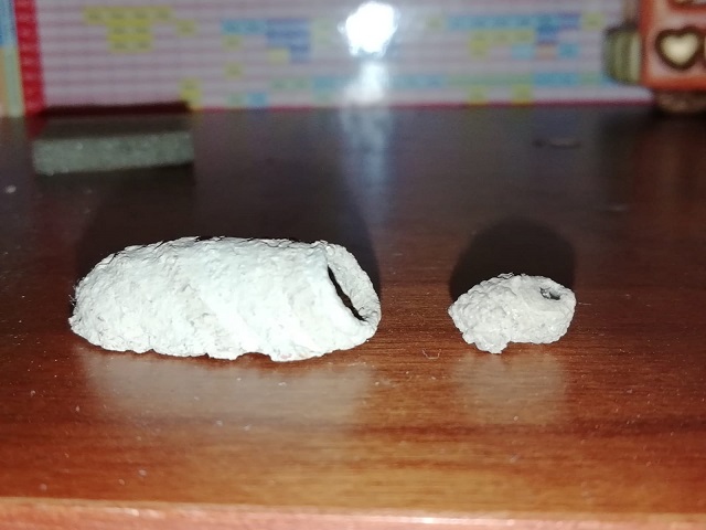 Ho portato a casa una delle cellette e ho fatto delle foto insieme ad un nido di S. curvatum per confronto (a posteriori, sarebbe stato meglio metterci un righello :lol: ), sfortunatamente dopo le foto ho accidentalmente rotto la fragile struttura, al suo interno c'era una capsulina bianca setosa vuota.