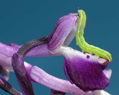 Questo piccolo bruco, stava sopra una piccola orchidea Anacamptis longicornu.