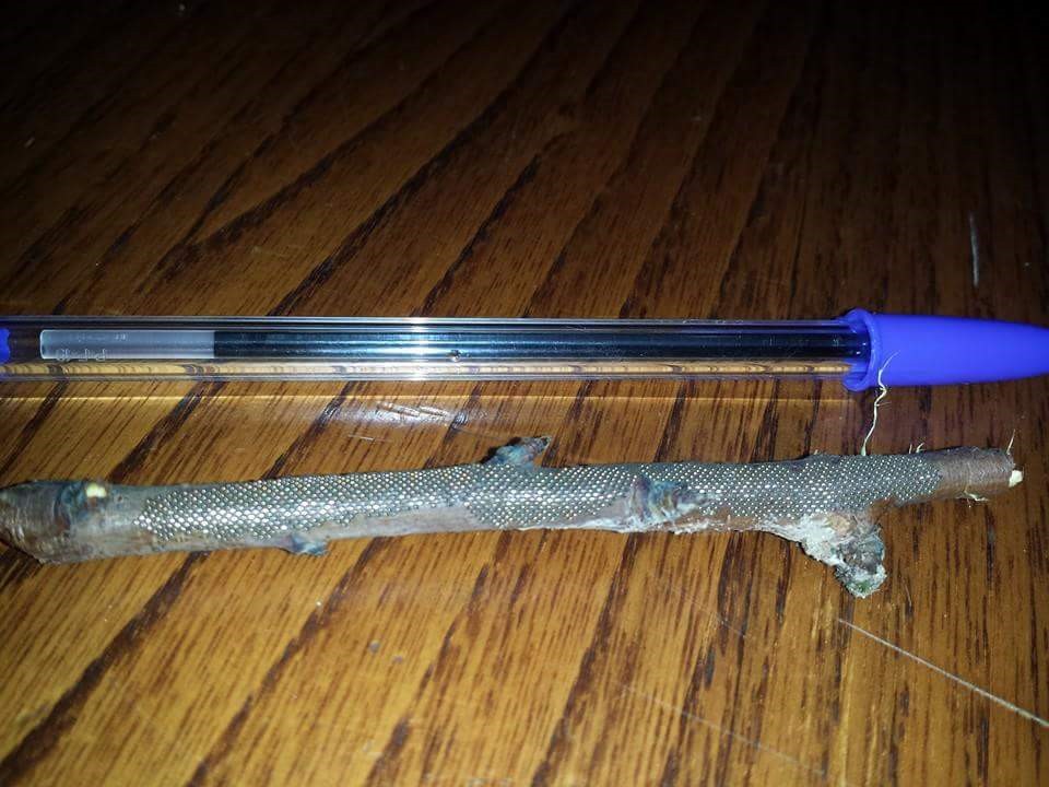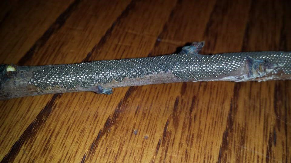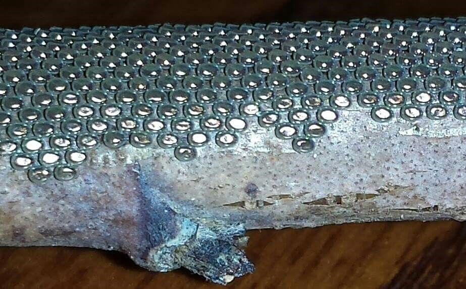 A me sembra un rametto terminale morto. Una cosa a cui forse non abbiamo fatto abbastanza attenzione sono le dimensioni di questa roba. Visto come è il ramo rispetto alla penna, siamo intorno a 1 cm di diametro per il ramo stesso, per cui queste uova, se tali sono, sarebbero circa da 0,5x1 mm. Mi vien quasi da pensare che potremmo aver sbagliato Regno (funghi?), se non fosse per la regolarità geometrica della distribuzione.