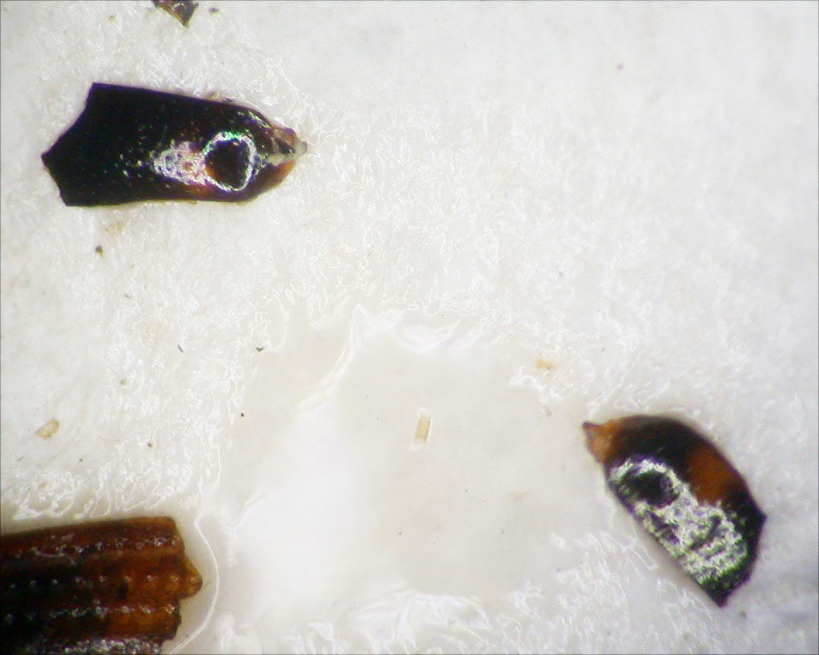 La prima foto d'insieme è utile principalmente per capire le dimensioni dei singoli resti, quasi tutte comprese tutte fra 1 e 2 mm.