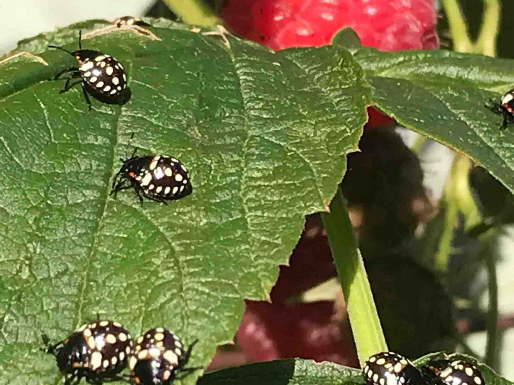 gruppo di insetti raggruppati sulla pagina inferiore della foglia del lampone