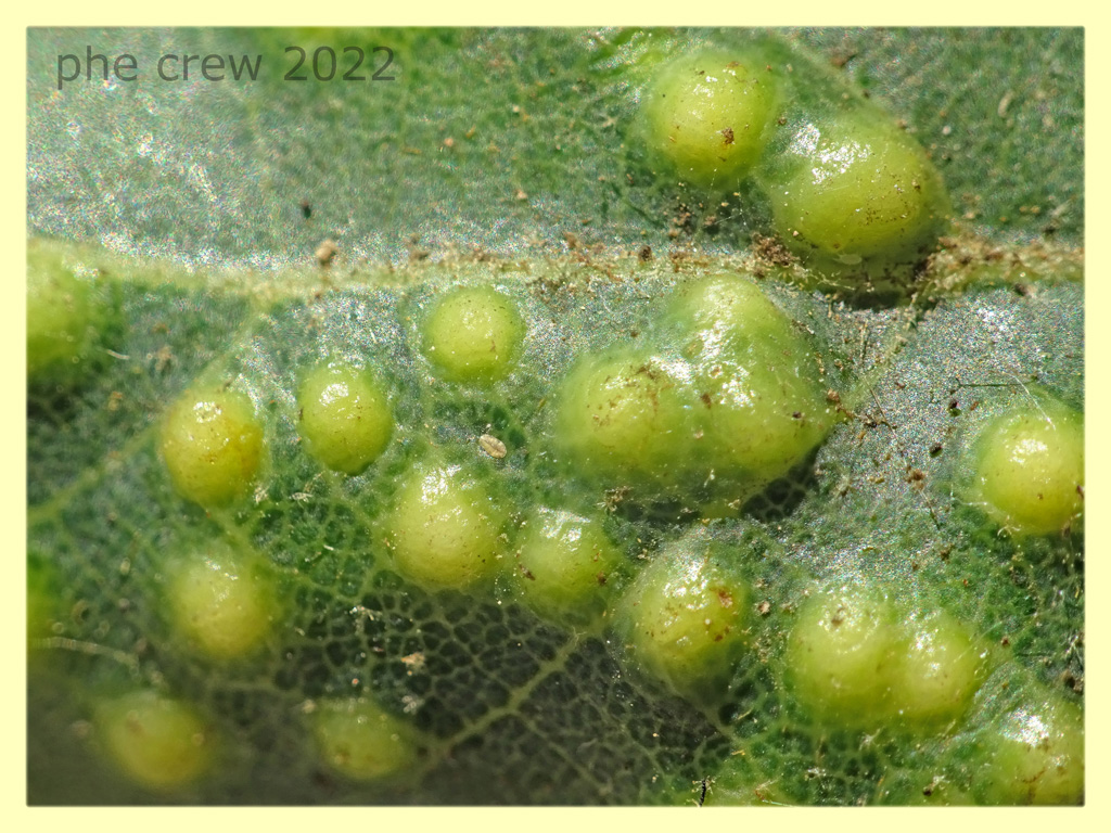 ….saranno galle ? ….la parte superiore della foglia e' quella tipo bolle lisce, invece dall' altro lato le bolle si presentano bianche e pelosette. Lo Psocottero c' entrera' qualcosa ? La pianta ospite sembra una Quercia. Ho spuntato voce Imenottero...in tal caso correggete. :hi: