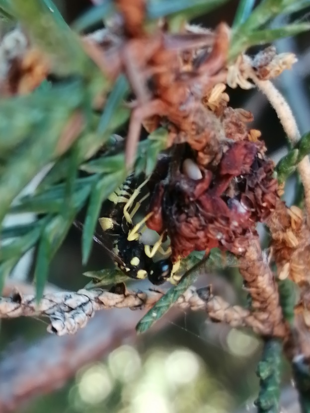 Innanzitutto mi scuso per la qualità delle foto, le zanzare mi stavano massacrando. Ho visto questa "vespetta" (dico vespa anche se volava più da sirfide che da vespa) avvicinarsi alle foglie di un cipresso, non ho capito che cosa stesse facendo ma sembrava che raccogliesse qualcosa... resina? oppure deponeva uova? Non so cosa pensare. Ho visto sugli stessi rami dei cosini tondeggianti bianco candido ma non sono riuscita a fotografarli perchè erano troppo piccoli