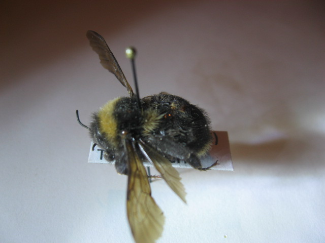 Dalle foto non si riescono a vedere bene alcuni caratteri importanti, anche perché l'addome è sporco (succede spesso ai bombi) e i colori sono oscurati. Mi sembra che sulle tibie posteriori manchi il "cestello" per la raccolta del polline: me lo puoi confermare, magari con un'altra foto? Se fosse così sarebbe un bombo del sottogenere Psithyrus. Sembra abbia due bande gialle sul torace, ma sull'addome? Di che colore è l'apice dell'addome?
