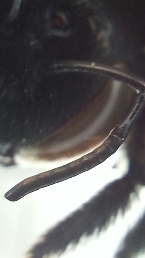 Il carattere delle antenne è riportato anche da Pagliano e Nobile, 1993 ma qui si valuta male. Nelle femmine io uso il carattere dell'area carenata della metatibia, molto affidabile e costante. Però non riesco a valutarla bene (mi sembra da valga); visto che le antenne paiono in una foto con articoli rossastri (ma non nell'altra) e piegate all'estremità verrebbe da dire maschio e allora violacea ma...ho seri dubbi.