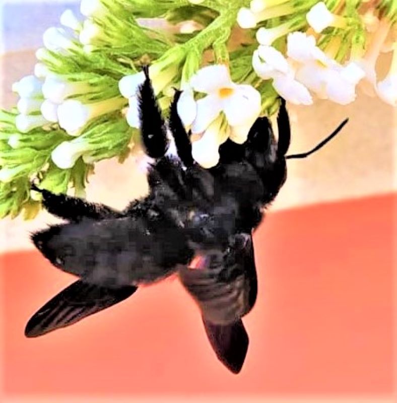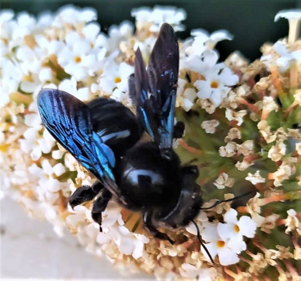 Questa mattina su una delle mie buddleje si è posata quella che a pria vista ho rtenuta una Xylocopa violacea ma che a un più attento esame è sembrata di dimensioni maggiori (come è anche mia impressione riguardo la Xylocopa valga) e con degli splendidi riflessi azzurro-verdi che l'altra non ha, almeno non cosi accentuati.