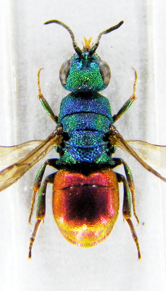 7 mm; a mio avviso dovrebbe trattarsi di una femmina di questa specie ma ovviamente attendo conferma da qualche Crisidaro doc di ritorno.