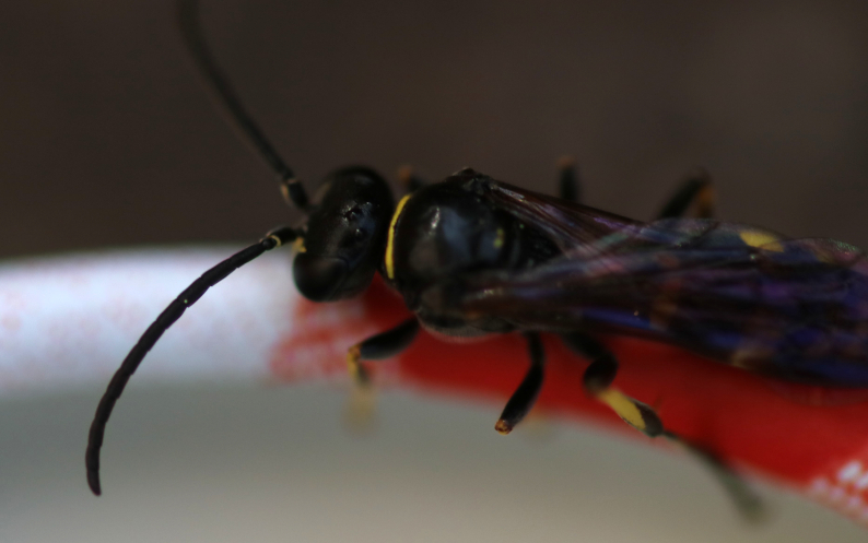 Anche schiarendo questa immagine, questo esemplare lascia perplesso anche me: sembra un Crabronidae ma escluderei tutti i Crabronini simili (capo diverso) e Mellinus del quale non pare avere il peduncolo e molte altre cose; tra quel che resta niente mi convince. Un Apoideo così glabro e fatto? Boh, non li conosco. Ci sono foto della venulazione alare completa?