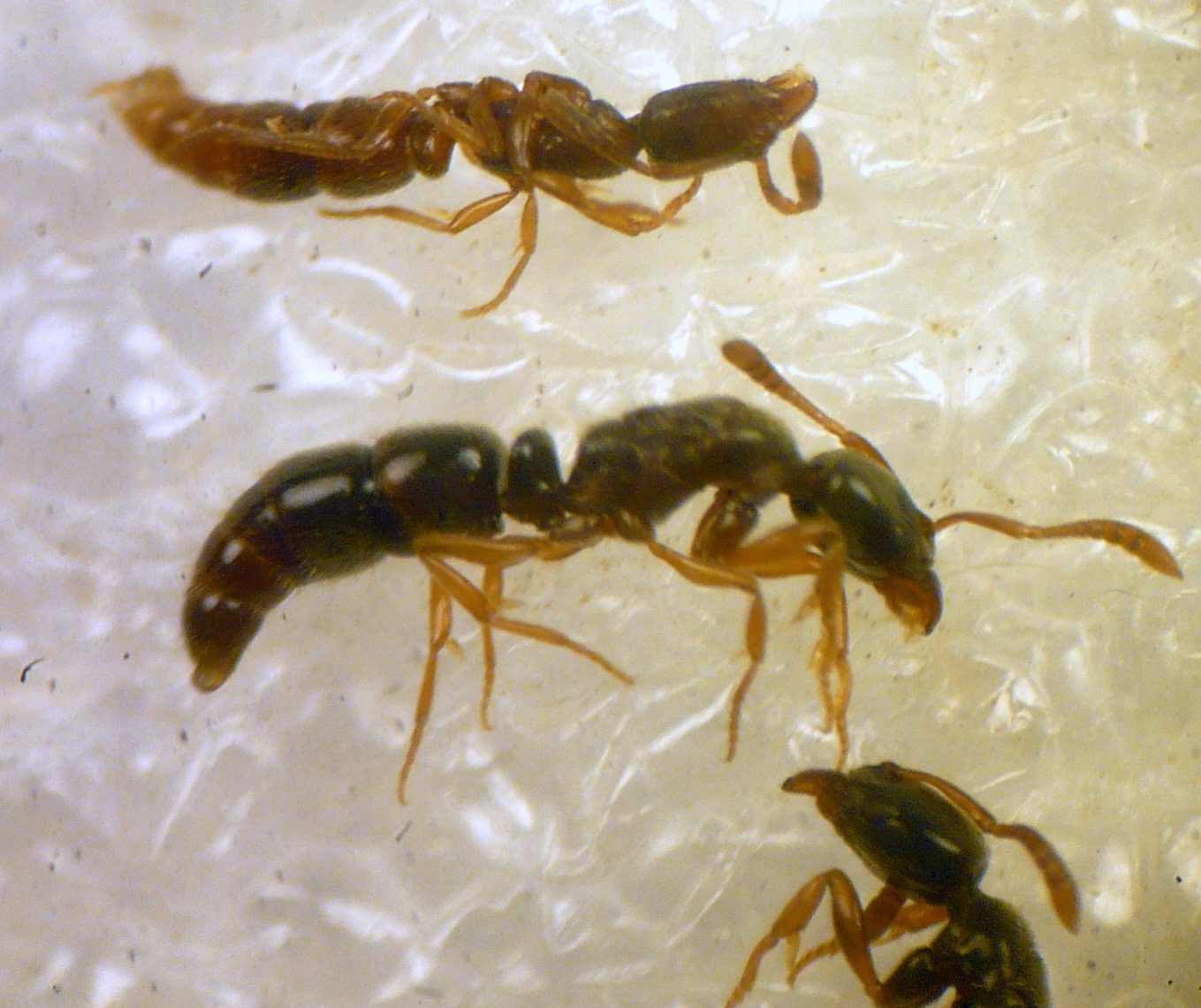 I am not sure but specimen in the middle of the second photo probably has a small transparent pore in front of the spine on the lobe on underside of petiolus. If the pore really exists then the specimen belongs to the genus Ponera (Hypoponera has no pore on the lobe). |