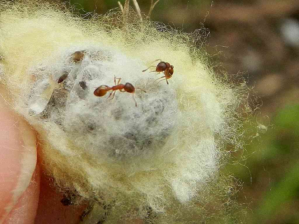 Io sono convinto che le formiche siano entrate nel bozzolo attraverso quello che sembra un foro al centro dell’involucro giallo per predare le larve di qualche insetto.