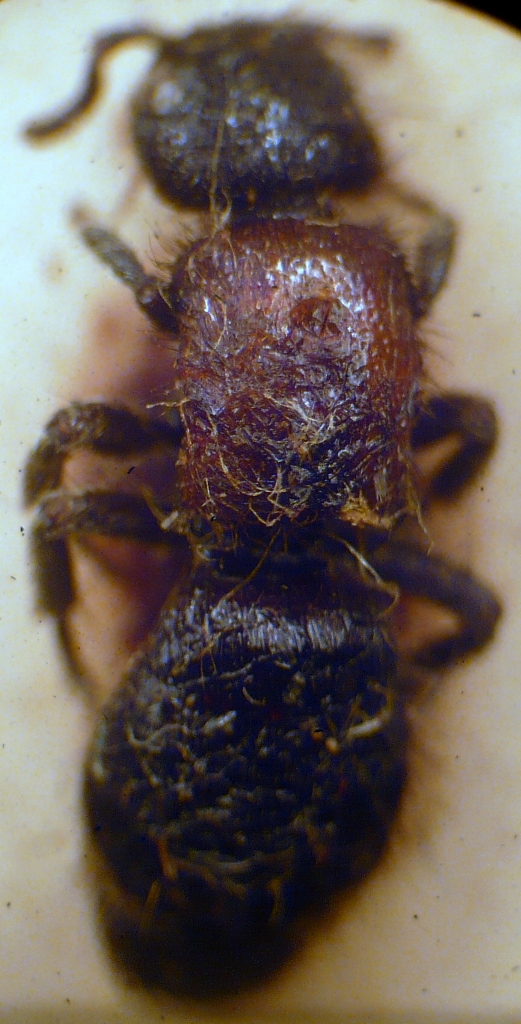 Ecco la foto migliore che dimostra l'arguzia e l'occhio attento dell'Ispettore Velvet (stò cercando di ingraziarmelo spudoratamente :mrgreen: ) e che rileva che il cadavere, dopo l'uccisione,forse effettuata immergendolo in qualche liquido non ben determinato (non mi risulta che i Mutillidi siano grassi....ma potrei sbagliare) è stato prima spillato e poi incollato su cartellino senza pietà :dead: