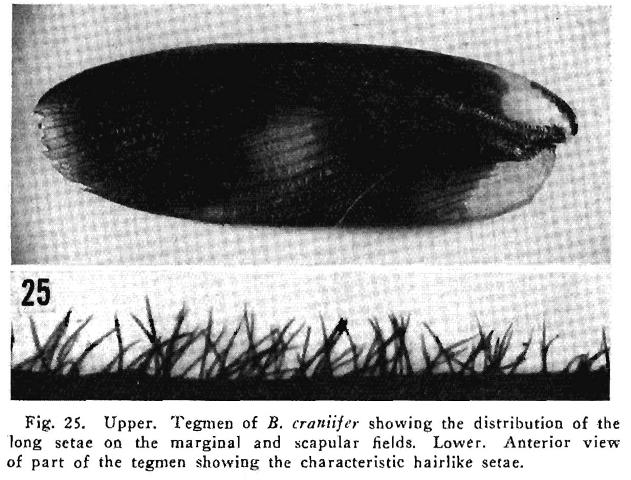 Vicino alla testa presenta su entrambe le facce delle tegmine dei fitti peli cortissimi di colore biondo, quindi è B. craniifer se non ho capito male.