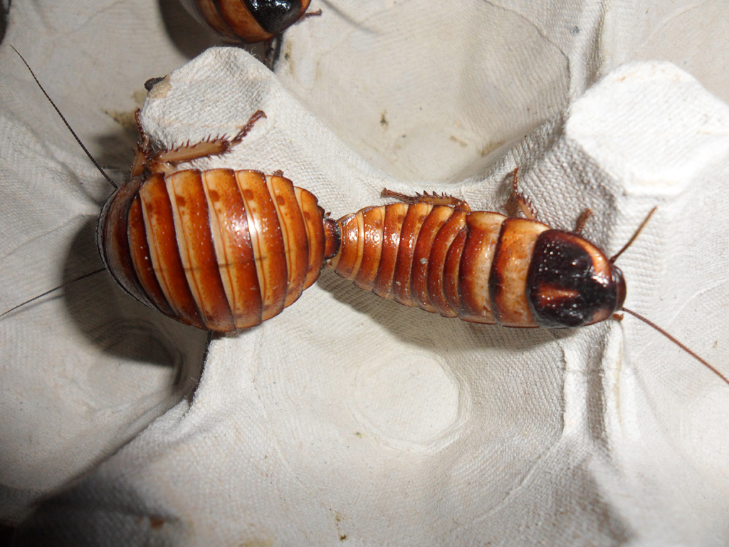 Non posso dire "belle!" perchè sempre scarafaggioni sono , però sono certamente interessanti.Sbaglio o queste specie giganti di Blatte vengono quasi tutte dal Madagascar o dall'Australia? La strana conformazione dell'addome di quella femmina sembra causata da una rottura dell'esoscheletro che poi si è risaldato male, forse durante la muta? |