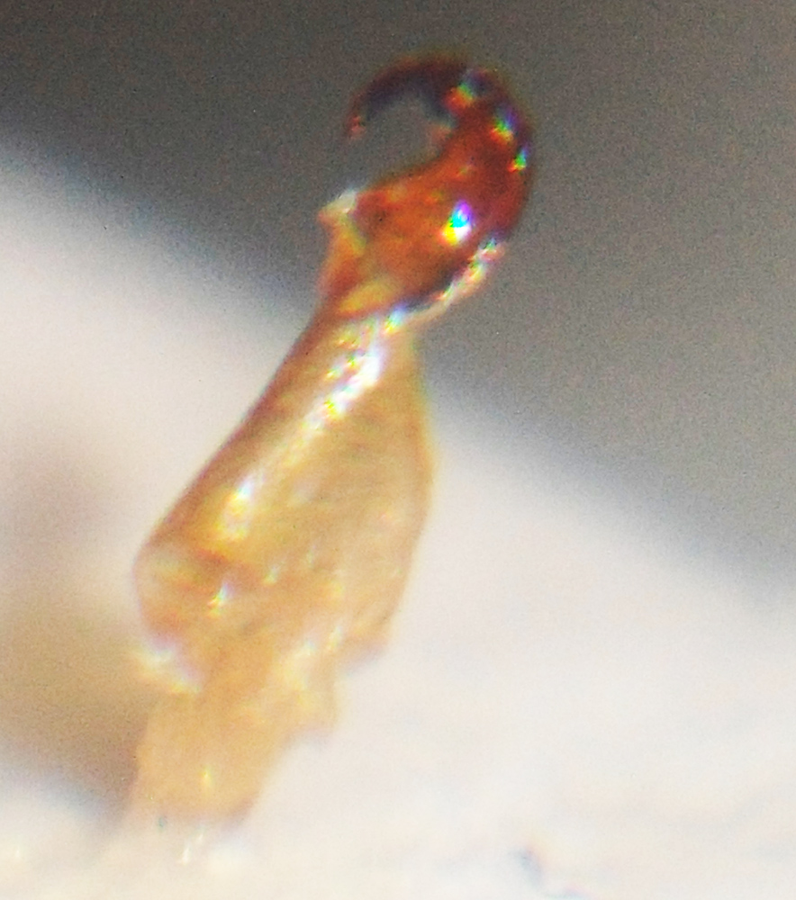 Per completezza inserisco anche la foto dell'edeago, purtroppo penosa dato che l'edeago è lungo meno di un millimetro. Spero che quando prenderò il microscopio potrò fare una foto migliore... |