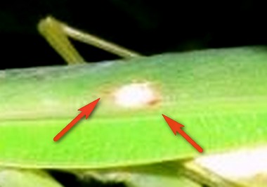 No, parlo della macchia sui femori interni. La macchia sul margine delle elitre (o meglio, tegmine) è lo stigma e anche quello, a proposito, non corrisponde alla descrizione di Giglio-Tos, che lo descrive come dotato di un ben marcato margine nero agli estremi, mentre nella foto di Valerio ha solo un lieve margine ocraceo.