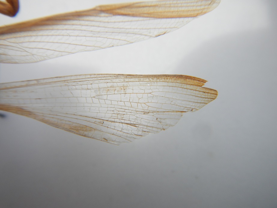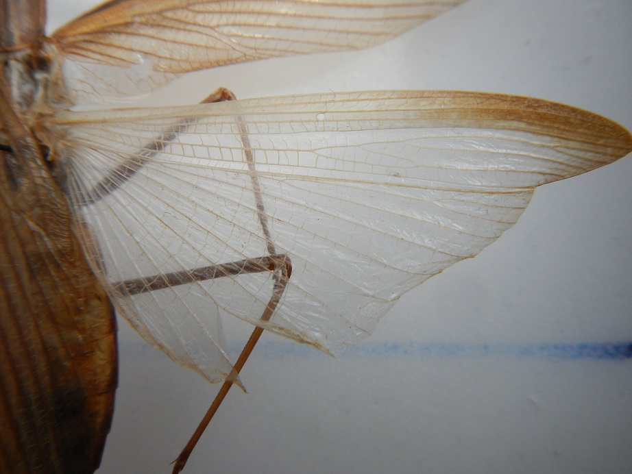 Inconfondibile per le tegmine ialine eccetto l'area costale, talvolta con riflessi argentei. Dimensioni molto piccole (maschio 58 mm).